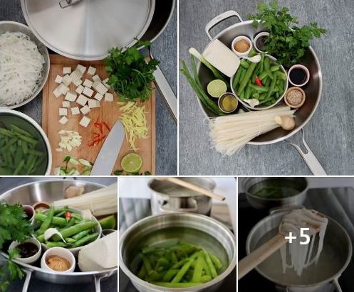 👉 fazuľové struky (250 g) vlož na minútu do vriacej a potom do ľadovej vody. Ryžové rezance (200 g) uvar 3 minúty, potom chlaď a zmiešaj s olejom.